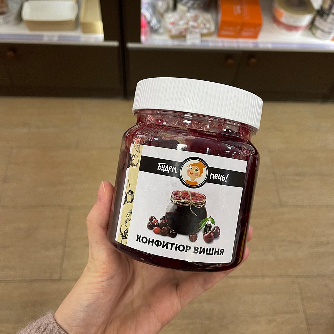 Состав: вишня, сахар-песок, патока, загустители (Е1442 крахмал, Е440 пектин), регулятор кислотности, ароматизатор "Вишня", сорбат калия, красители, вода очищенная.